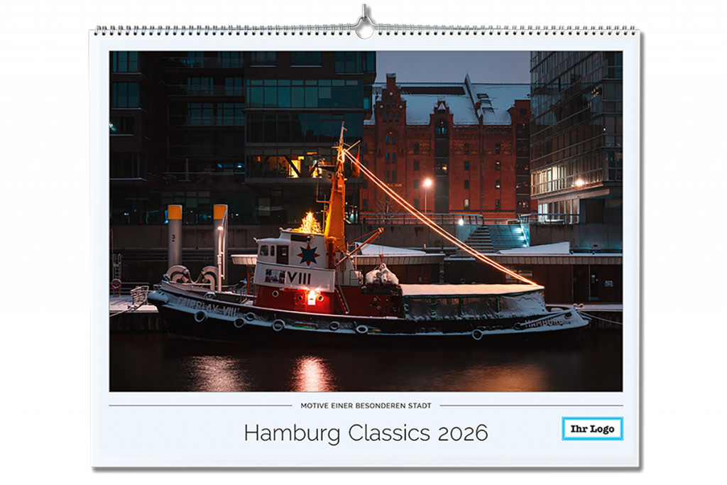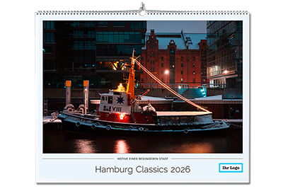 Der Schlepper Fairplay VII schmückt den Kalennder aus dem Jahr 2025. Diese Bildserie steht Ihnen auch weiterhin zur Verfügung: Ein Blick in den Sandtorhafen, die Kattwykbrücke, die Köhlbrandbrücke sowie die Ellerntorsbrücke, das Chile-Haus, der Blick vom Turm der Nikolaikirche, der Waltershofer Hafen, der Leuchtturm Rissen, Ericusspitze und Rödigsmarkt: eine vielseitige Kalenderserie mit vielen markanten Hamburg-Fotos.