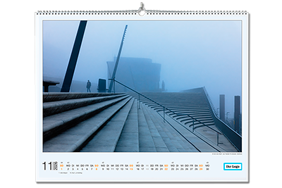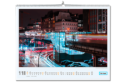 Auch der Kalender Typ 22a zeigt eine gelungene Mischung markanter Hamburg-Motive, jeweils in besonderem Licht fotografiert: Mit dem nächtlichen, verlassenen St. Pauli während des Lockdowns, der Speicherstadt, Elbphilharmonie, Scheibenhochhaus in der City Nord, Hermes-Hochhaus, einer spannenden Park-Haus Innenansicht finden sich hier typische Hamburger Bauwerke.