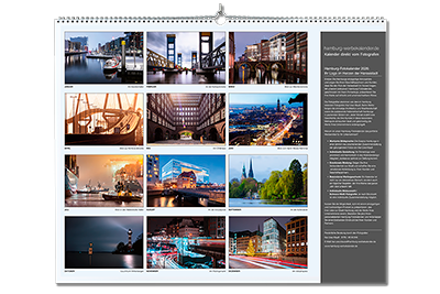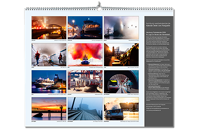 Die Motive drehen sich um die HafenCity, Hamburger Industrielandschaften, Binnenalster, den Hamburger DOM, die Speicherstadt und dem Rissener Leuchtturm. Prinzipiell können Sie diesen Kalender mit diesen Fotografien auch in Schwarz-Weiß bestellen.